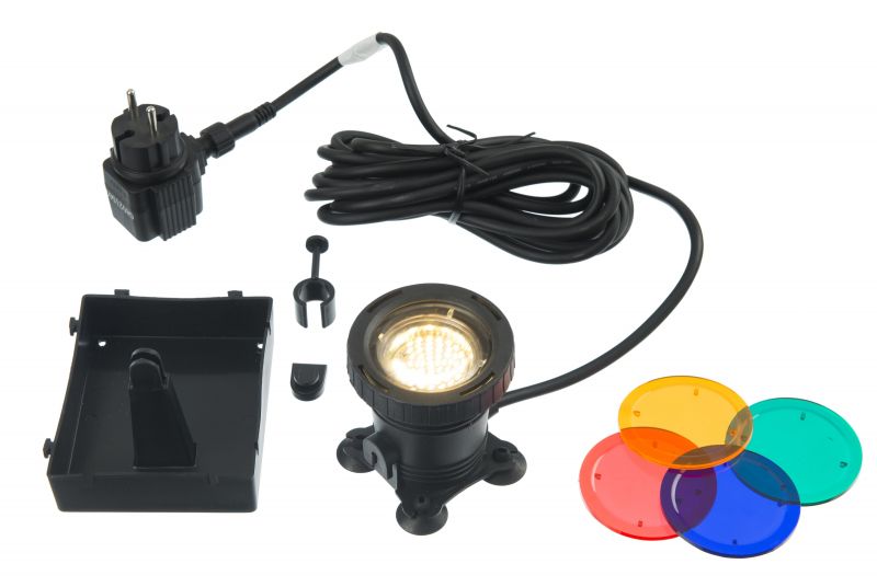 Ubbinkin vesitiivis LED-allasvalaisin (IP68, luokka III), varustettu MR 16-LED-lampulla ja neljällä värillisellä levyllä (ABS) (oranssi, sininen, punainen, vihreä).