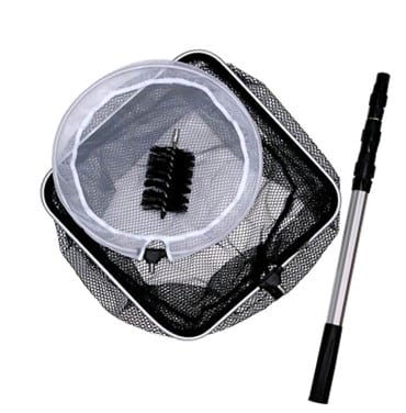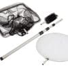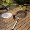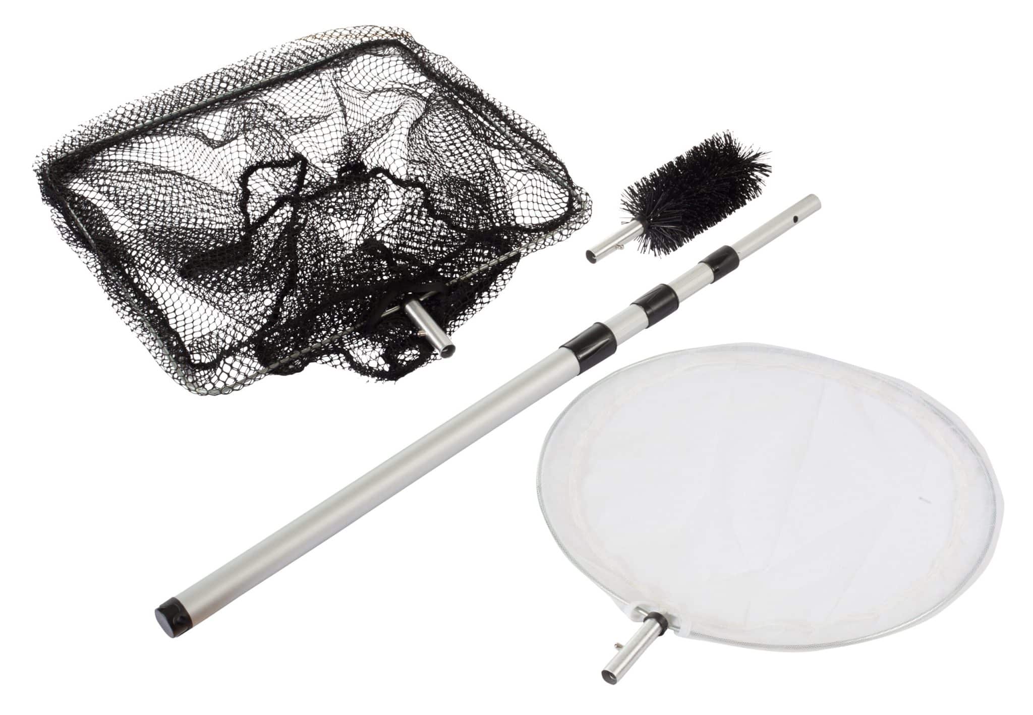3 in 1 – lammenpuhdistussarjalla saat kaikki tärkeät apulaiset nopeaan lampien tai uima-altaiden puhdistamiseen. Setti koostuu levä- ja lehtihaavista 36 x 36 cm, pyöreästä pinnanpuhdistushaavista, jonka halkaisija on 36 cm, leväharjasta 13 cm ja käytännöllsiestä teleskooppikahvasta (55-150 cm), jonka avulla pääsee käsiksi kulmiin, jotka eivät ole niin helposti tavoitettavissa.