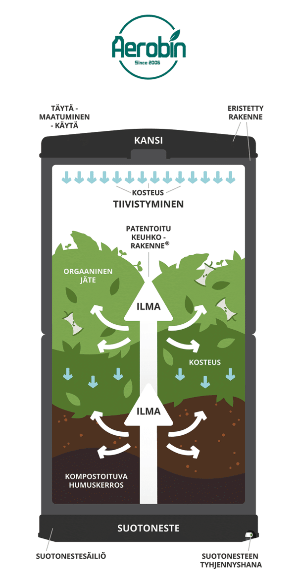 Aerobin 200 l on lämpökompostori, joka on tarkoitettu ympärivuotiseen kotitalous- ja puutarhajätteiden kompostointiin.