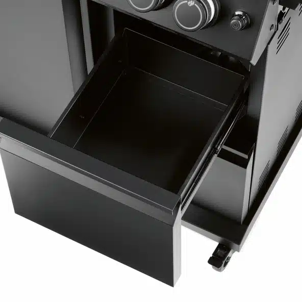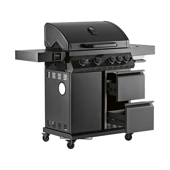 Upea Rexon-perheen mattamusta uutuus jossa 4 poltinta, infrapunasivukeitin joka saavuttaa jopa 800 asteen lämpötilan, digitaalinen lihamittari oikean grillaustuloksen saavuttamiseksi ja vetolaatikot joista toisessa kaksiseinämäinen lämpölaatikko GN-astialla ja kannella. GN- astiassa voit mainiosti pitää raikkaita juomia ja grillattavia tuotteita.