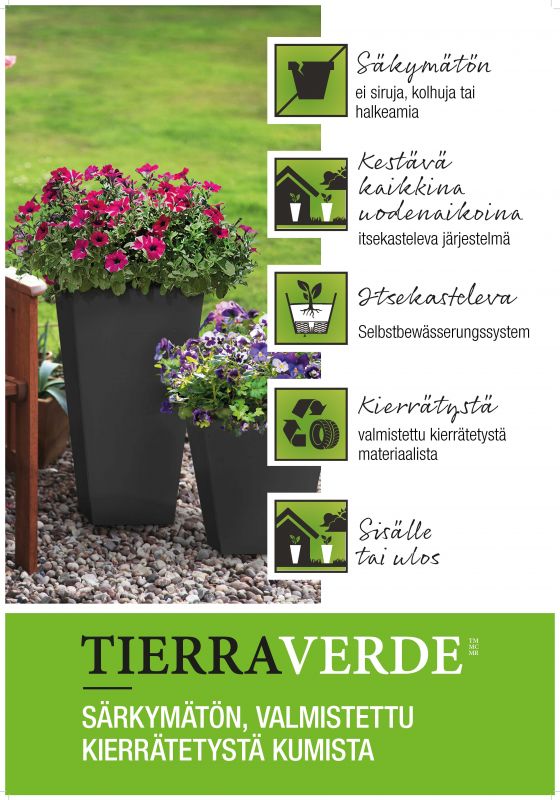 Itsekasteleva järjestelmä: Alta kastelussa reilu vesitila, joka vähentää kasteluväliä.