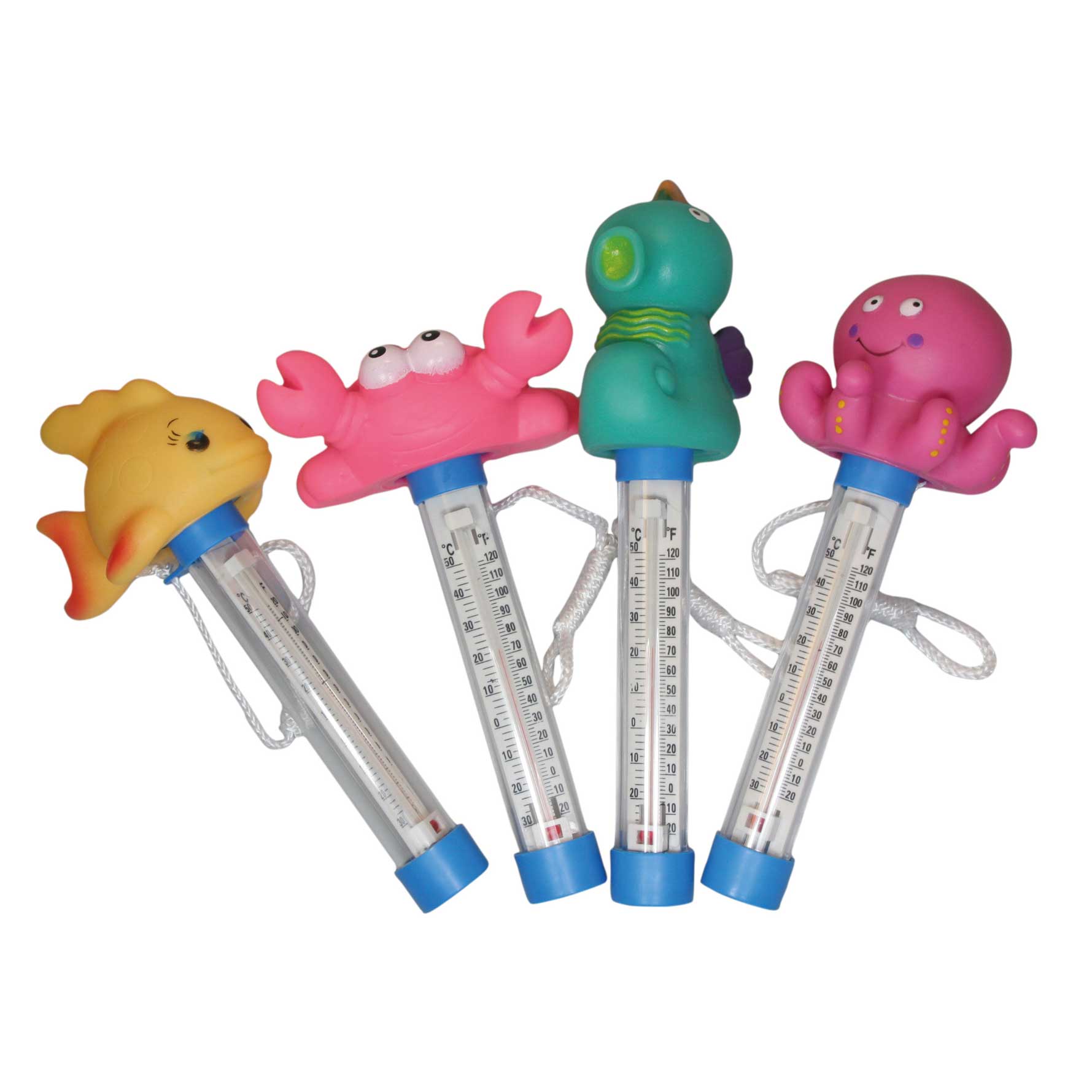 Kelluva allasvesilämpömittari, jonka yläosassa on erilaisia eläinhahmoja, kuten rapu, trooppiset kalat, merihevonen tai mustekala.