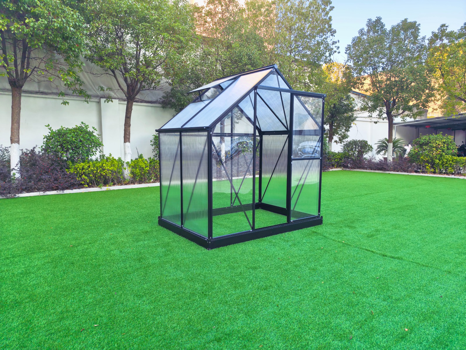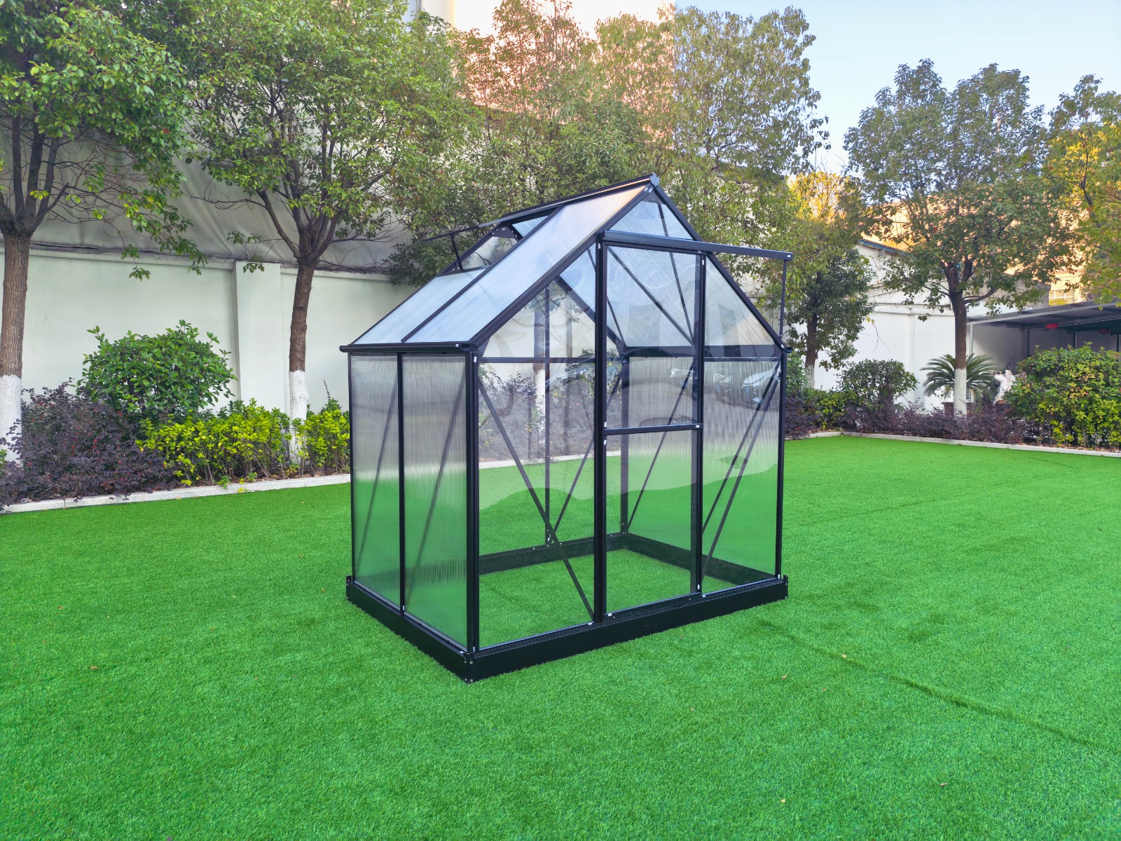 Seinät ja katto: UV-suojattua, vahvuudeltaan 4 mm polykarbonaattikennolevyä, jonka valonläpäisykyky on 82 %. Kennolevy eristää hyvin lämpöä ja luo samalla kasvihuoneeseen kasvien kannalta oikeanlaisen hajavaloympäristön. Se estää kasveja saamasta liikaa auringonvaloa, jotta herkät kasvit eivät pala, sekä suojaa pakkaselta ja haitallisilta UV-säteiltä.