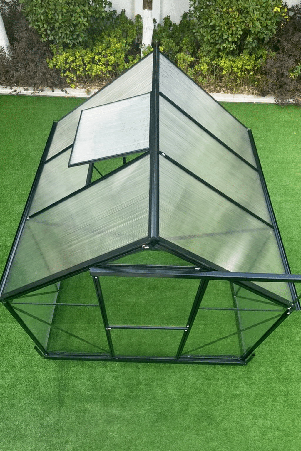 Etu- ja takapäädyt: Kristallinkirkasta, UV-suojattua 0,5 mm polykarbonaattia, jossa on lähes 100 % valonläpäisykyky. Näin ollen kasvihuoneeseen on helppo nähdä sisälle, mikä helpottaa kasvien kasvun ja veden tarpeen havainnoimista. Tästä johtuen tämä lasitusyhdistelmä takaa parhaat kasvuolosuhteen kasveille.