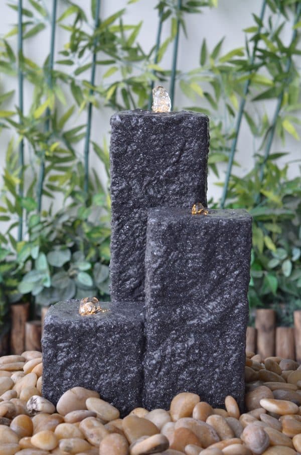 Näyttävä kolmen pylvään vesiaihe LED-valoilla. Valmis täydellinen setti sisältää altaan, kannen altaalle, pumpun ja liitäntätarvikkeet.