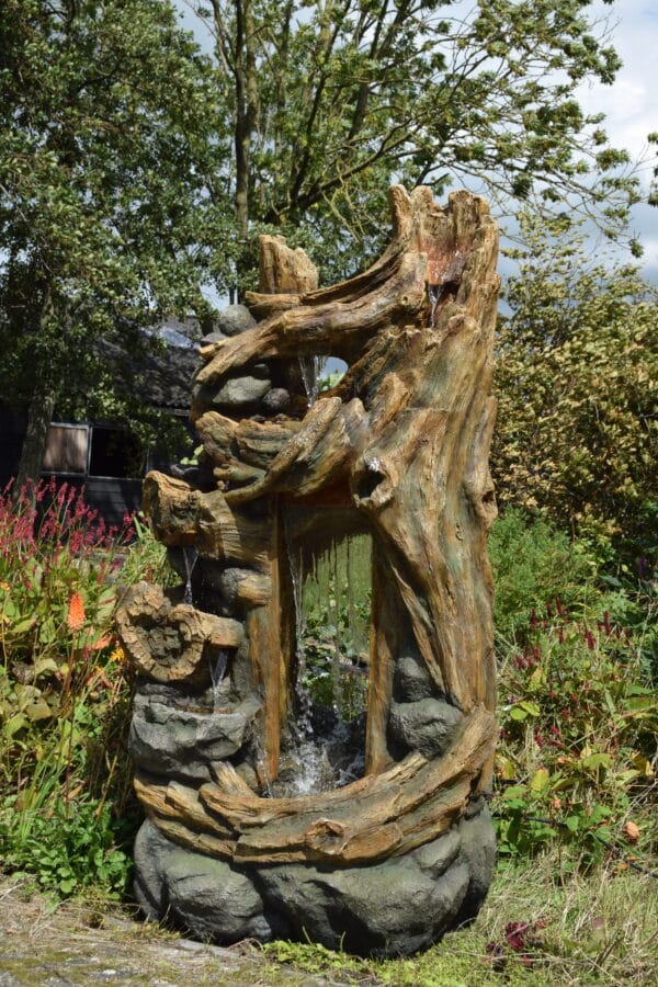 Näyttävä liitä & käytä -vesielementti polyresiinistä. Vanhojen puiden rungot eri korkeuksilla muodostavat vesiputouksen huipulle, vesi virtaa rungosta runkoon. Jokaista allasta valaistaan ​​LED:eillä. Kevyt ja kestävä materiaali, integroidulla säiliöllä ja pumpulla optimaaliseen vedenkiertoon suljetussa piirissä.
