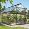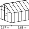 Laadukas kasvihuone mustalla alumiiniprofiilirungolla ja kasvihuonelaseilla. Kaksi kattoluukkua ja yksi liukuovi. Leveys 2570 mm ja pituus 3840 mm.